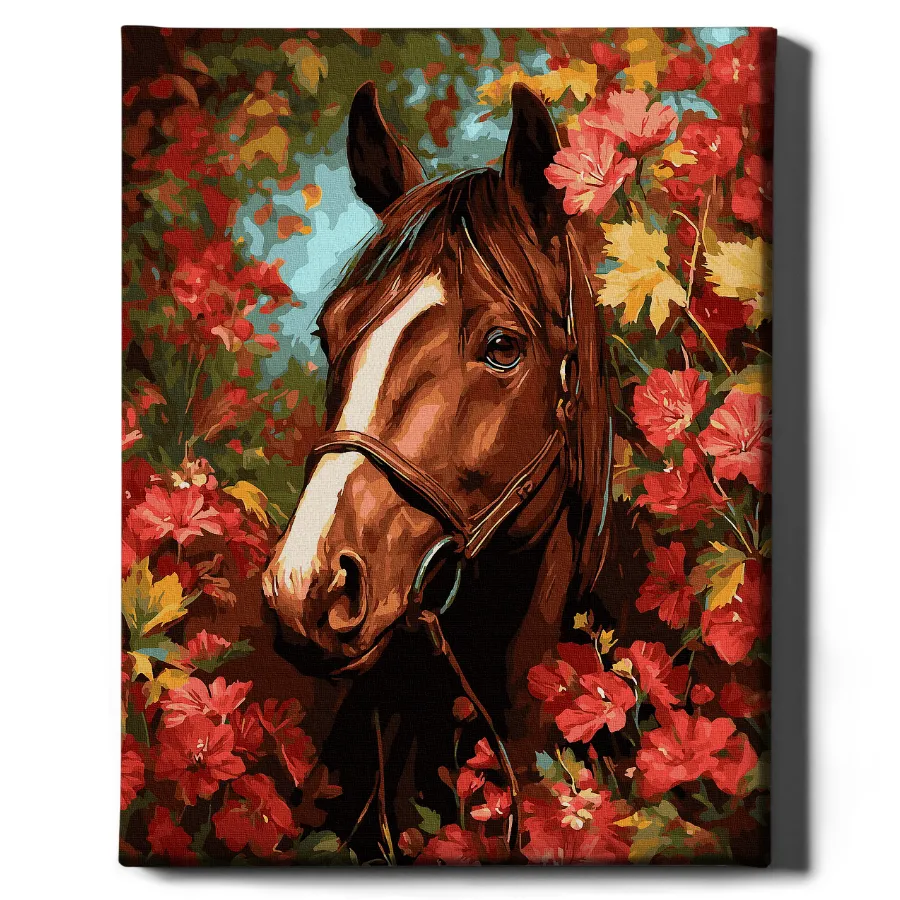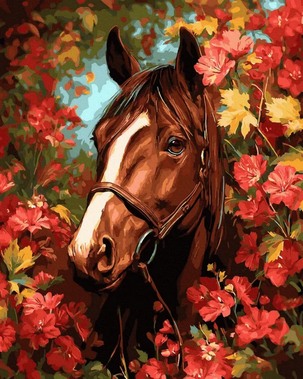 Hevonen kukkien keskellä