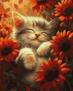 Kissanpentu kukkien keskellä