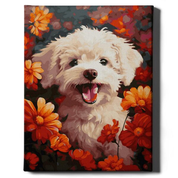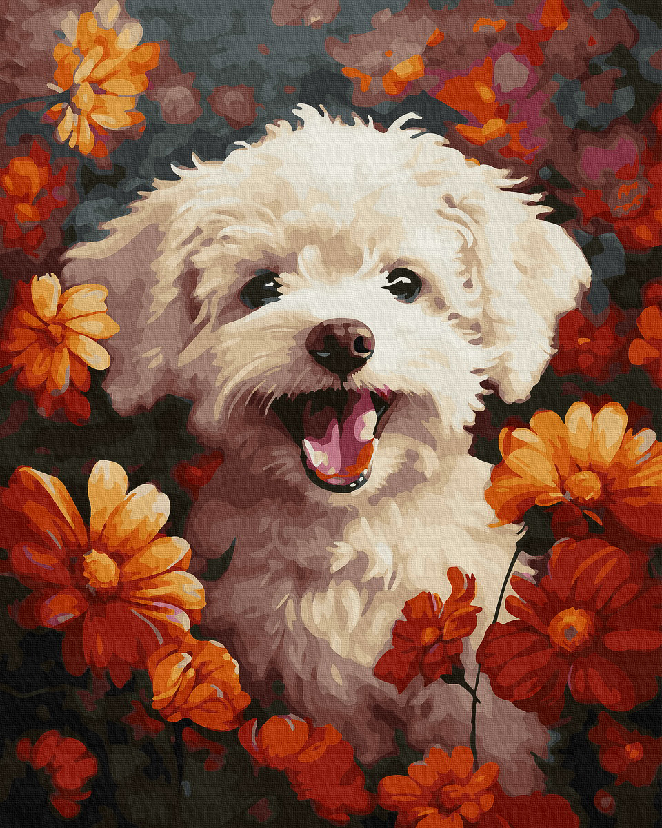 Koira kukkien keskellä